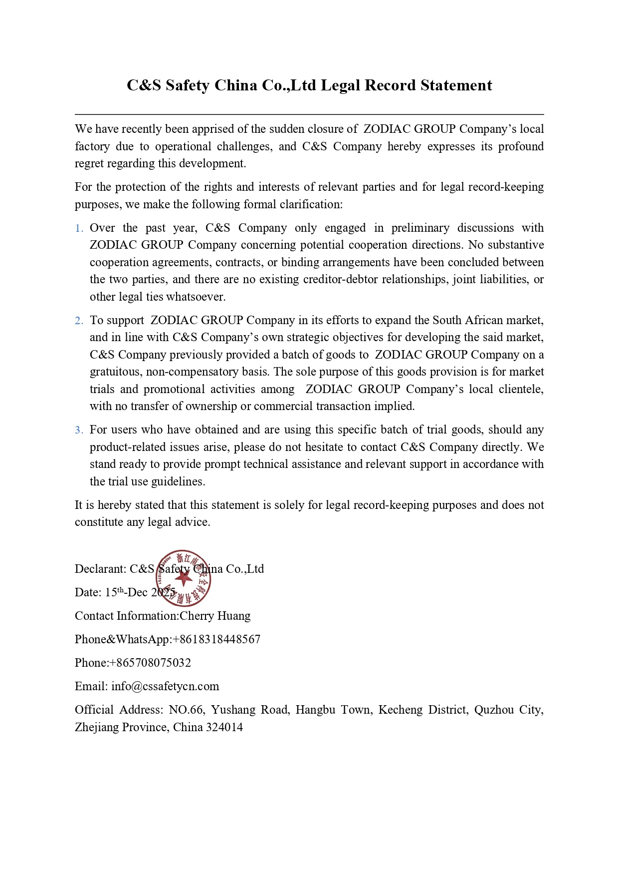C&S Safety China Co.,Ltd Legal Record Statement